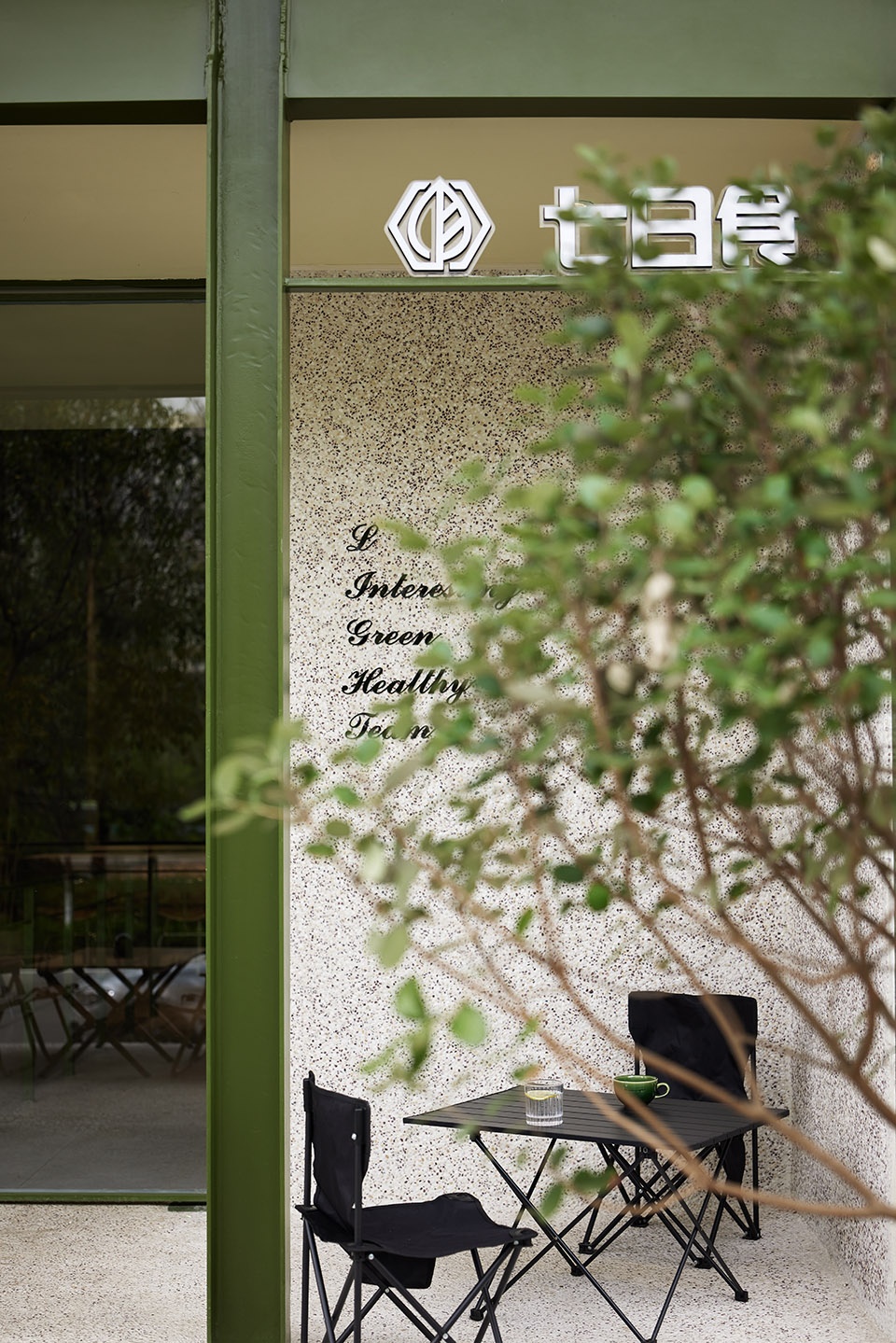 门头设计以原始结构为基础,绿色框架开放式布局,选用大面积落地窗组合而成,最大限度的将光线与视野引入室内,轻盈的外立面充分呈现出健康、年轻、随性的表达。户外摆放着休闲椅,热闹街道的人来人往,吹着湖边清凉的微风,自觉代入露营风的舒适与自在。将茂盛的自然植被引入室内,与湖边四季遥相呼应,在此,享受时光的流转,细品生活的惬意。