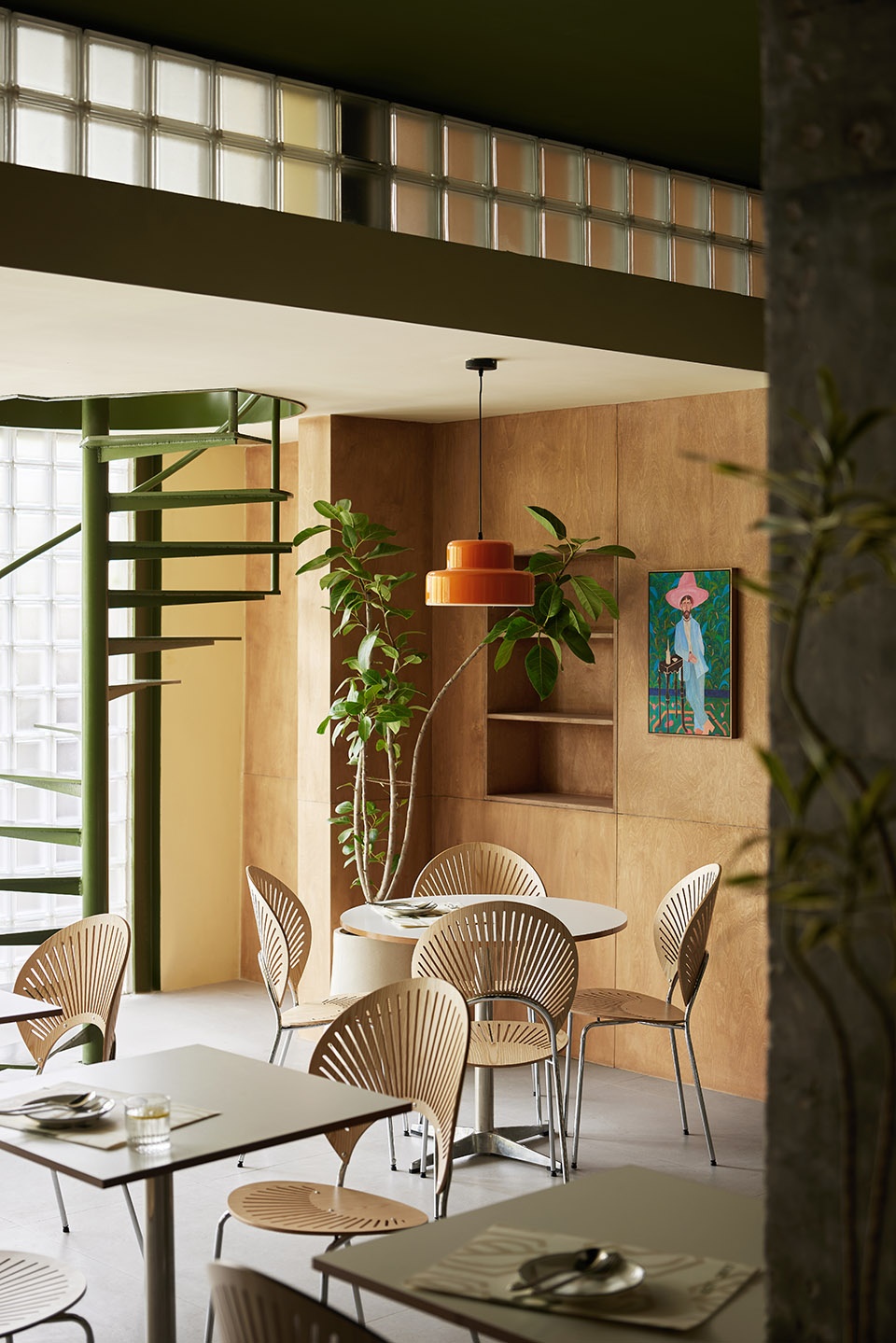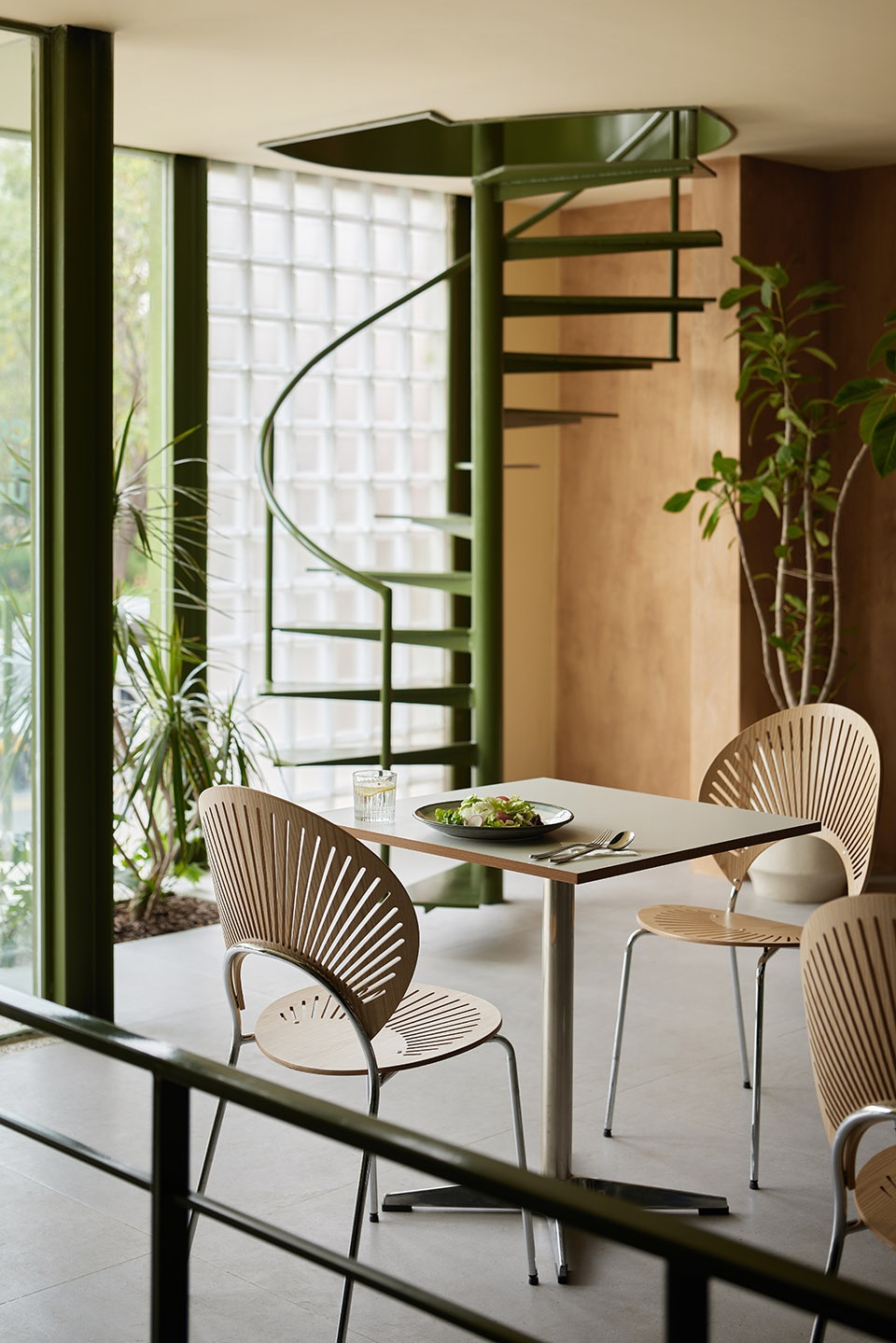 Combined with concrete and environmentally friendly wood, the natural atmosphere of the space has been fully expressed. Glass brick design makes direct natural light liquefied and soft, blurring the boundary between indoors and outdoors. The green spiral staircase stands quietly, creating a brighter and more relaxed atmosphere between the light and shadow, leading people upstairs to explore.