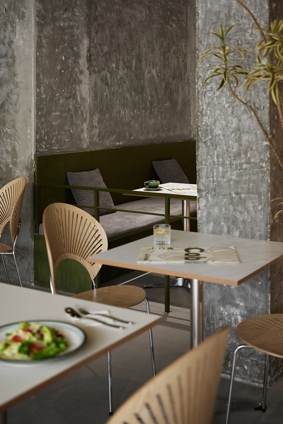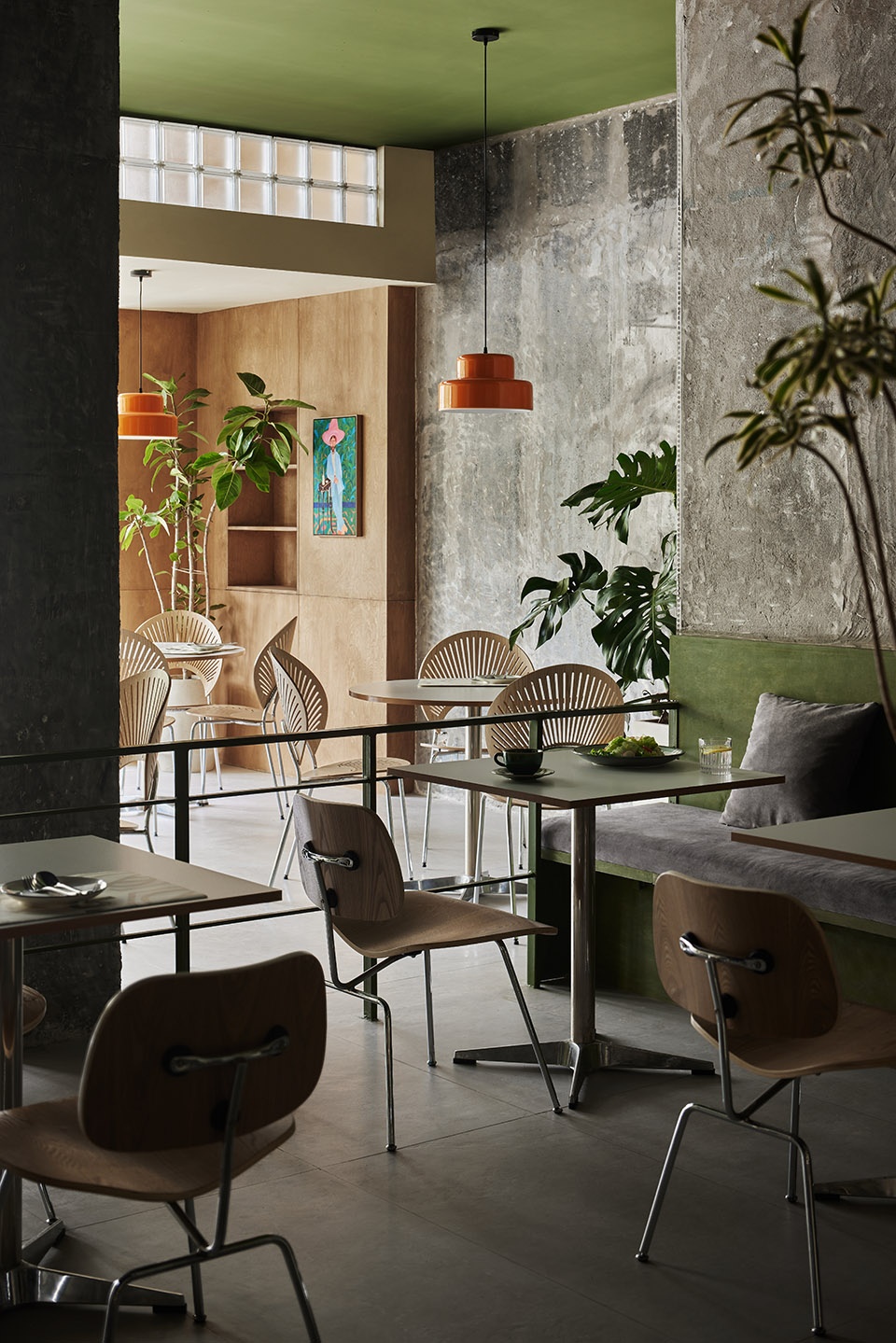 在空间结构上呈现了开放性,混凝土水泥平铺空间底色,原木色和绿色增添空间自然质感,通过不同材质、不同粗细的肌理呈现视觉层次。保留了原始的承重结构,水泥裸柱呈现自然之美,自由流畅的动线布局,同时保持了人与人、桌与桌之间有效的舒适距离。无论在室内任何位置,都能享受健康美食与轻松社交。