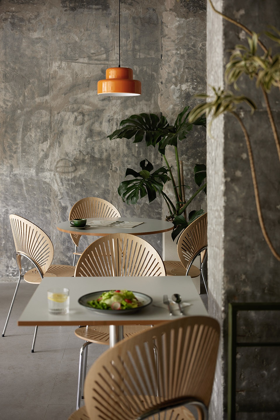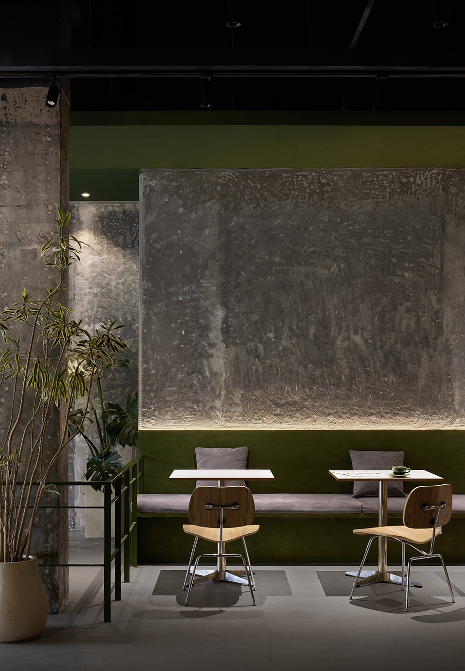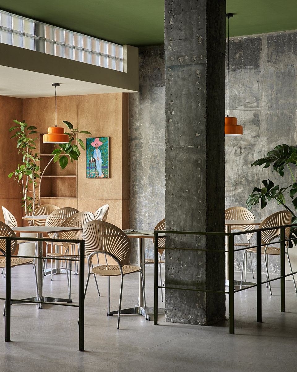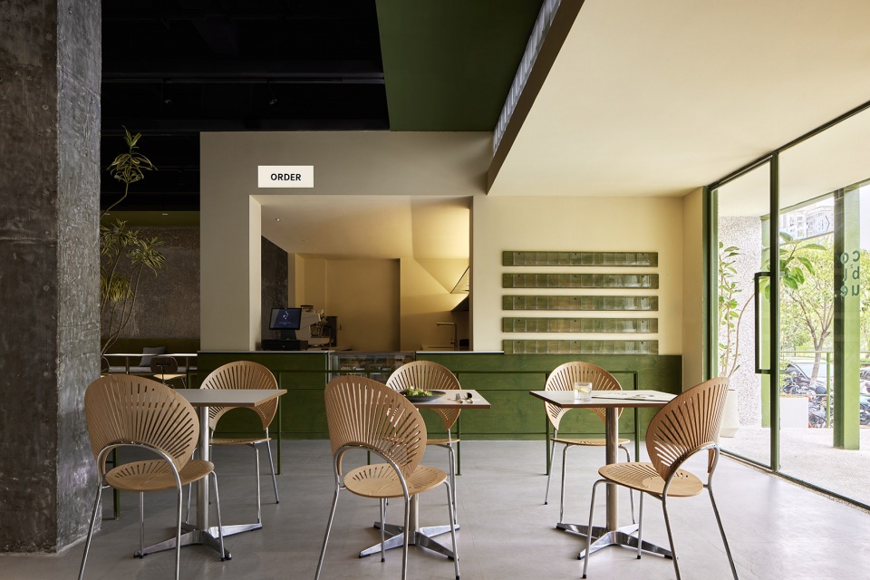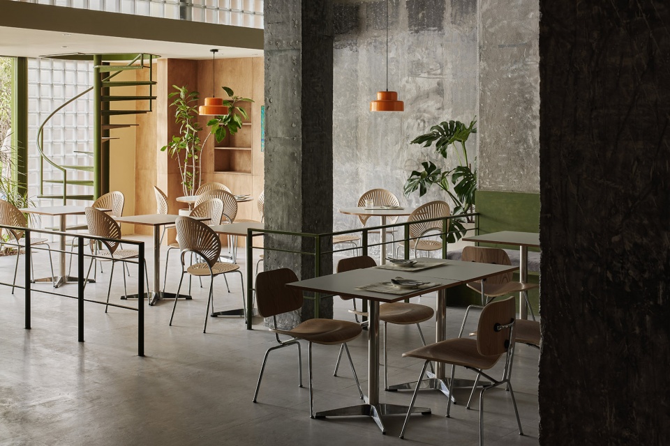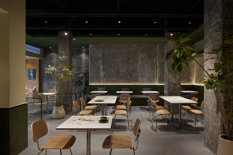 The spatial structure presents openness, with concrete and cement paving as the base colour of the space, and the natural texture of the space is enhanced by the colour of logs and green. The visual hierarchy is presented through different materials and textures of different thicknesses. The original load-bearing structure is retained, and the bare cement column presents natural beauty, free and smooth moving line layout, while maintaining an effective and comfortable distance between people and tables. You can enjoy healthy food and cosy social interaction no matter where you are indoors.