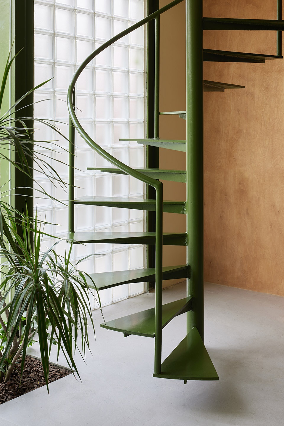 结合混凝土、环保木材的使用,让空间的自然氛围感得到了充分表达。玻璃砖设计,将直射自然光线液化柔和,模糊室内外的界限。绿色旋转楼梯静静矗立,在光影间更显明亮与轻松氛围,将人们引入楼上一探究竟。