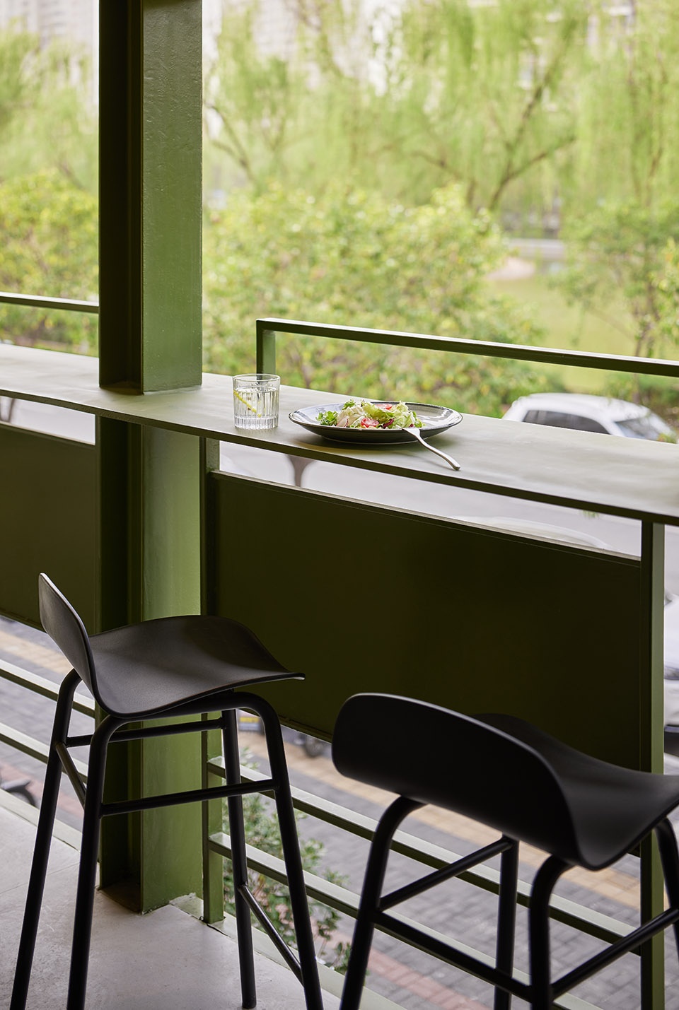 二层刻意留出户外露台空间,更好的让室内外相结合,城市的街景一览无余,绿意盎然相映成趣。一顿简餐一杯果汁,沉浸在浪漫的 brunch,宁谧舒服的小角落。