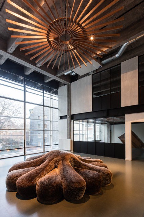 Anaïs Torfs 说:“在这里你可以在工作之余在酒吧休息片刻,在植物边工作,坐在图书管立面或者是在 Aster 椅子上躺下休息,欣赏大阶梯的景观,在这里,自由尤其重要。” 房间和墙面装饰艺术品来源于安特卫普的 PLUS-ONE 画廊,Sofie Van De Velde 和布鲁塞尔画廊 Veerle Verbakel。建筑内还有 Serge Hannecart 的私人永久收藏品,展览了艺术家 Damien Hirst 和 Fabre 的作品以及一些古董家具。