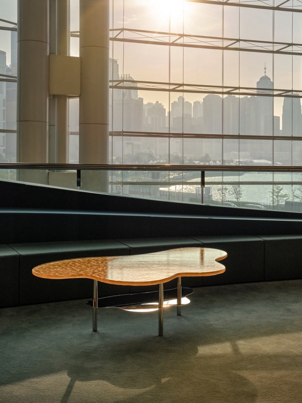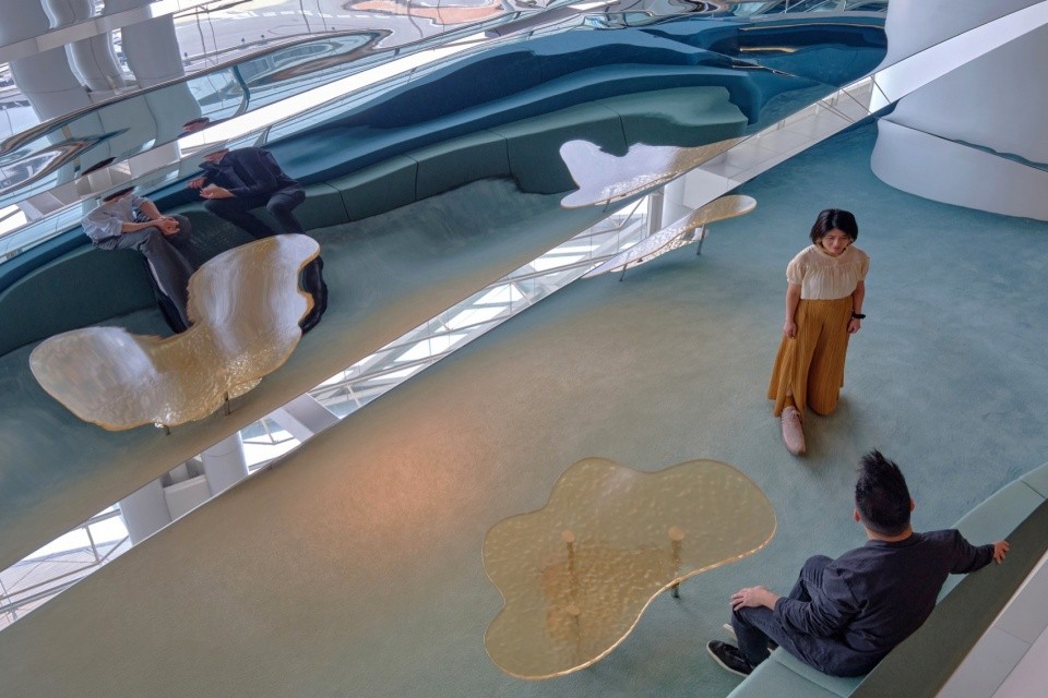简洁雕塑形体的设计灵感来自维多利亚港的迷人景色。这个渐变体量摹仿了天空和远处景观之间的地平线,宾客可以在这里目睹光线和倒影不断变换的奇观。柔和、多彩、触感良好的地面与轻盈、抛光、反射的悬浮天空表面形成鲜明对比。