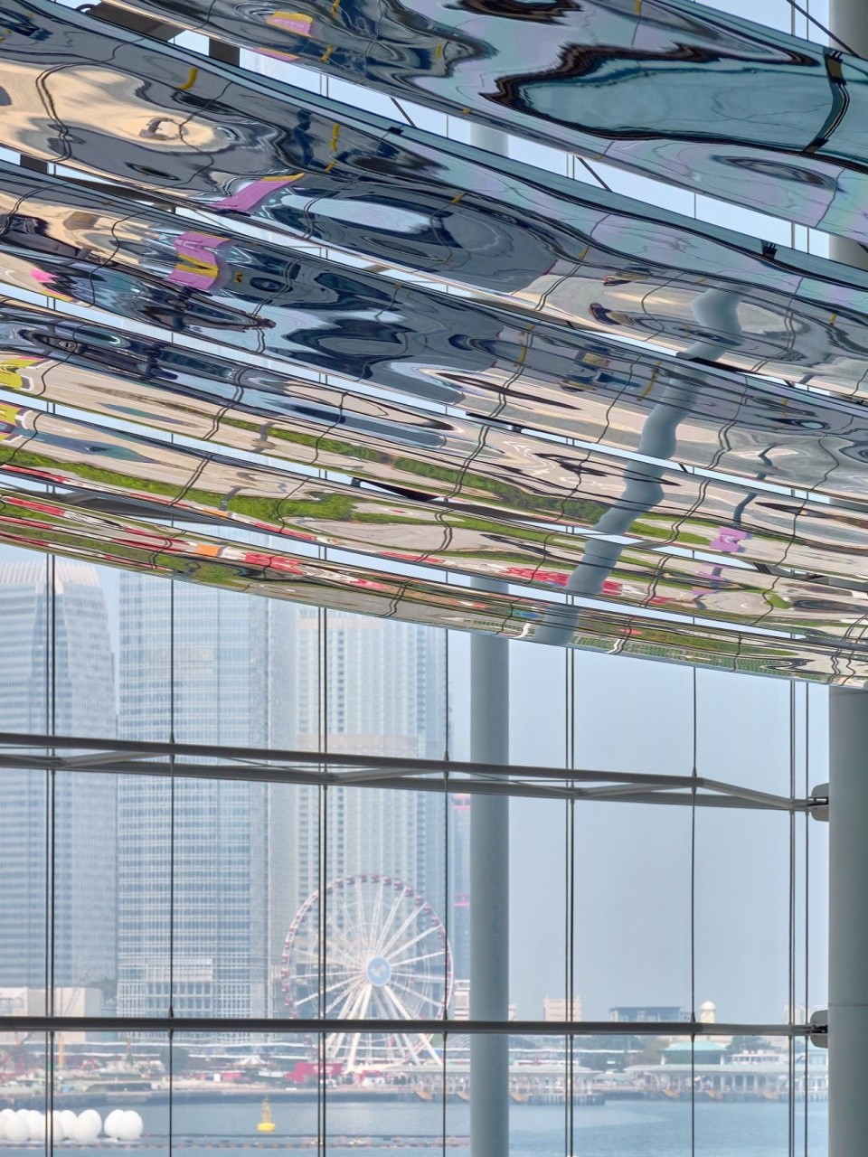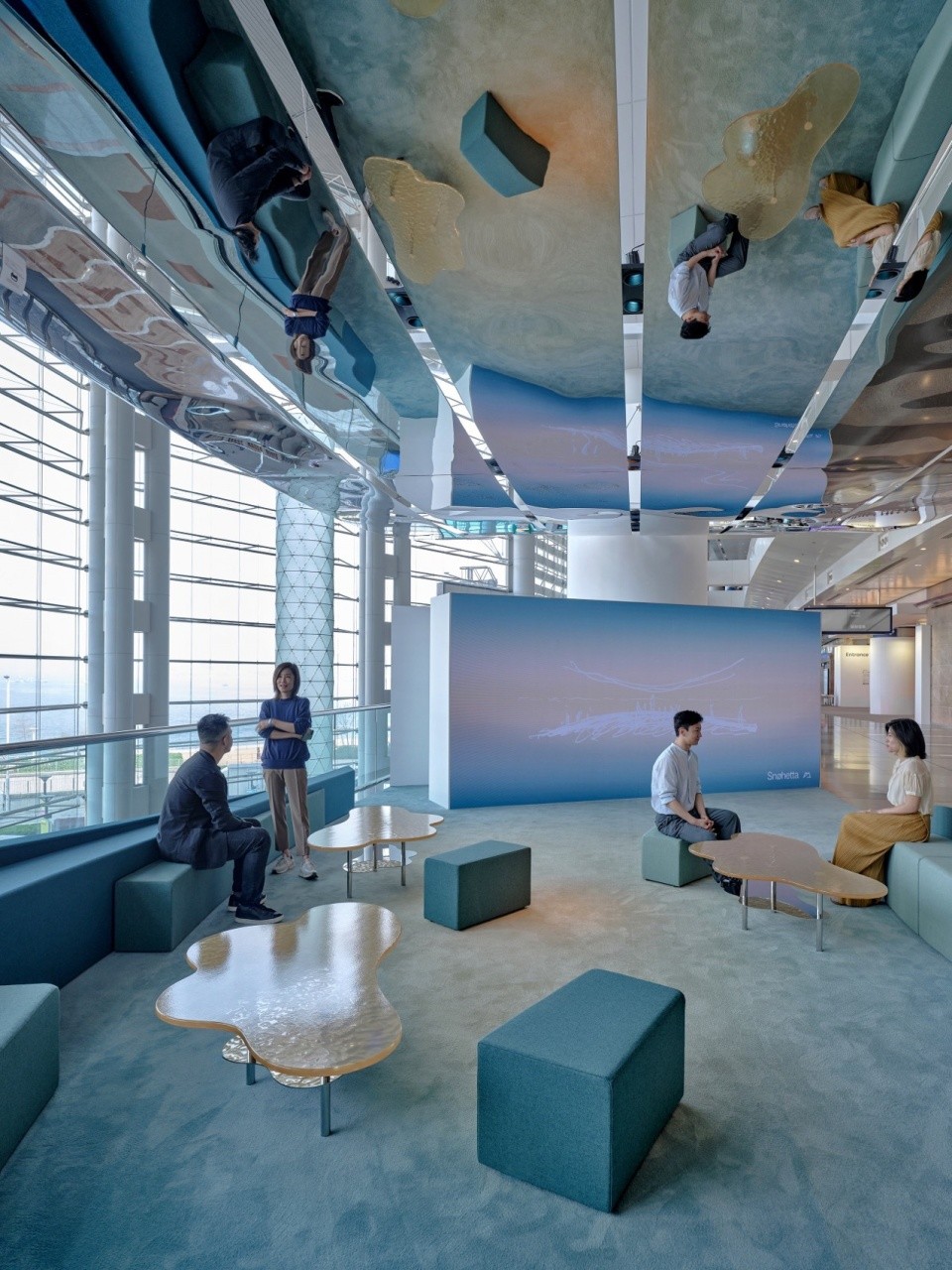 The design for the simple sculptural form is inspired by the stunning views of the city’s Victoria Harbour. This gradient volume between the sky and the landscape beyond is the horizon where guests witness the spectacle of continuously shifting light and reflections. The soft, colourful and tactile ground plane contrasts with the light, polished, and reflective surface of the suspended sky.