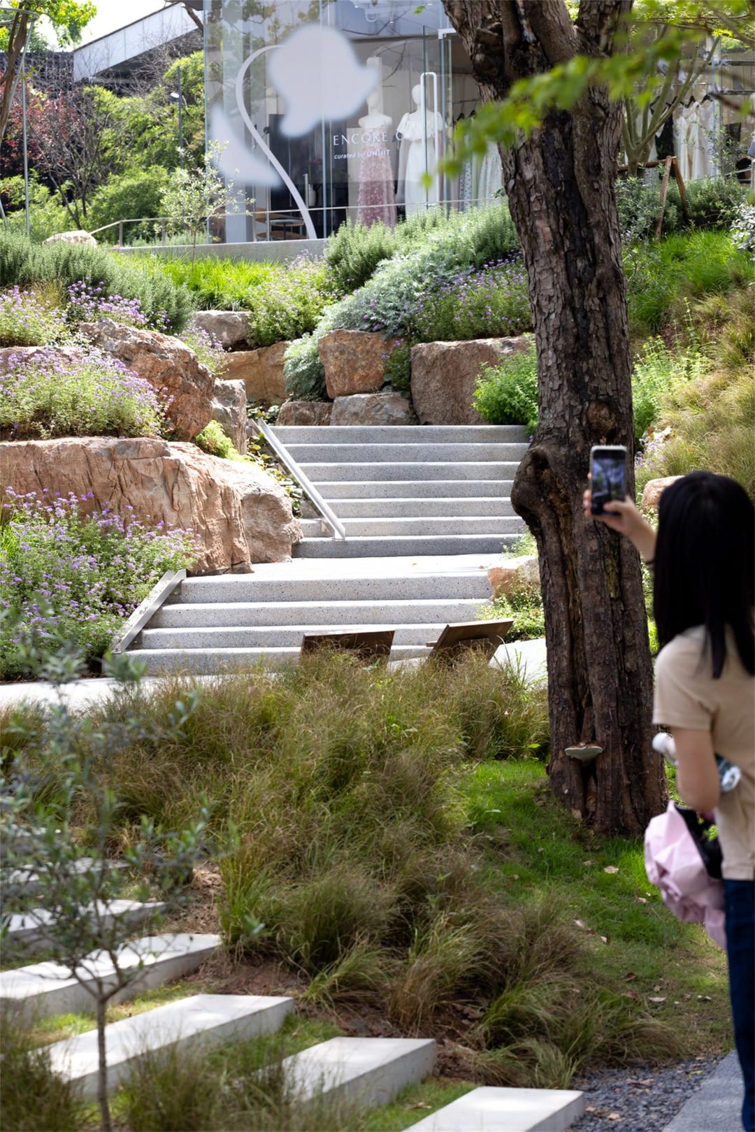 整体设计,场地一体化的呈现,从硬质铺装、里面材料到植物系统的表达,都希望尝试以长期主义设计的方式去做思考,不仅反扣项目初期成本的原则,也希望通过低维护的环境系统表达可持续的理念。在人们多次到达场地后,能感受到场地变化带来的欣喜,并同时为购物体验带来更多乐趣。