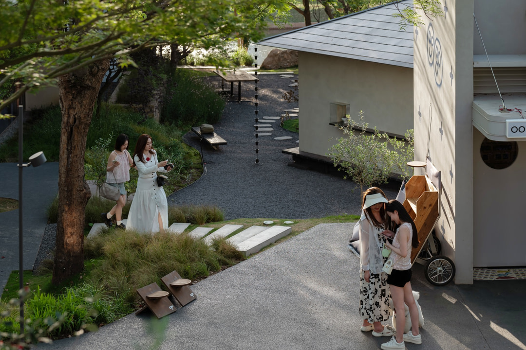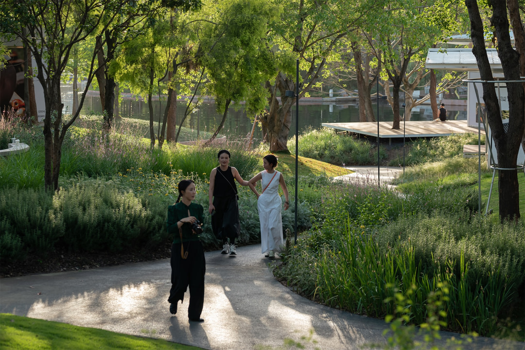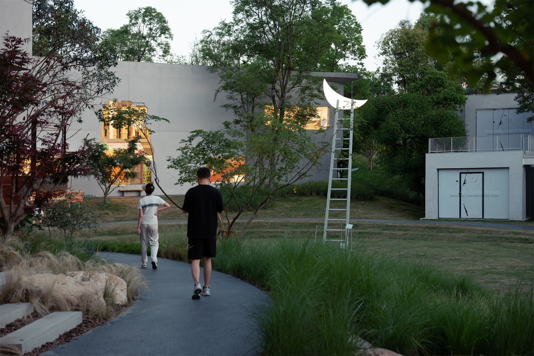 阿制**昱道景观**:CPI 是成都万华在麓湖的一处新零售业态的目的地。通过因地制宜的设计原则,对原有场地的改造更新,将” 去设计化” 概念贯穿始终,使其更适应新的场所使命。利用现状植物群落、错落的建筑布置、场地的丰富地形,穿插布置各种游逛通道,拓展商业品牌景观面、经营外拓空间等,打造出移步易景、轻松丰富的环境空间,使场地环境对商业支撑得到最大程度体现。