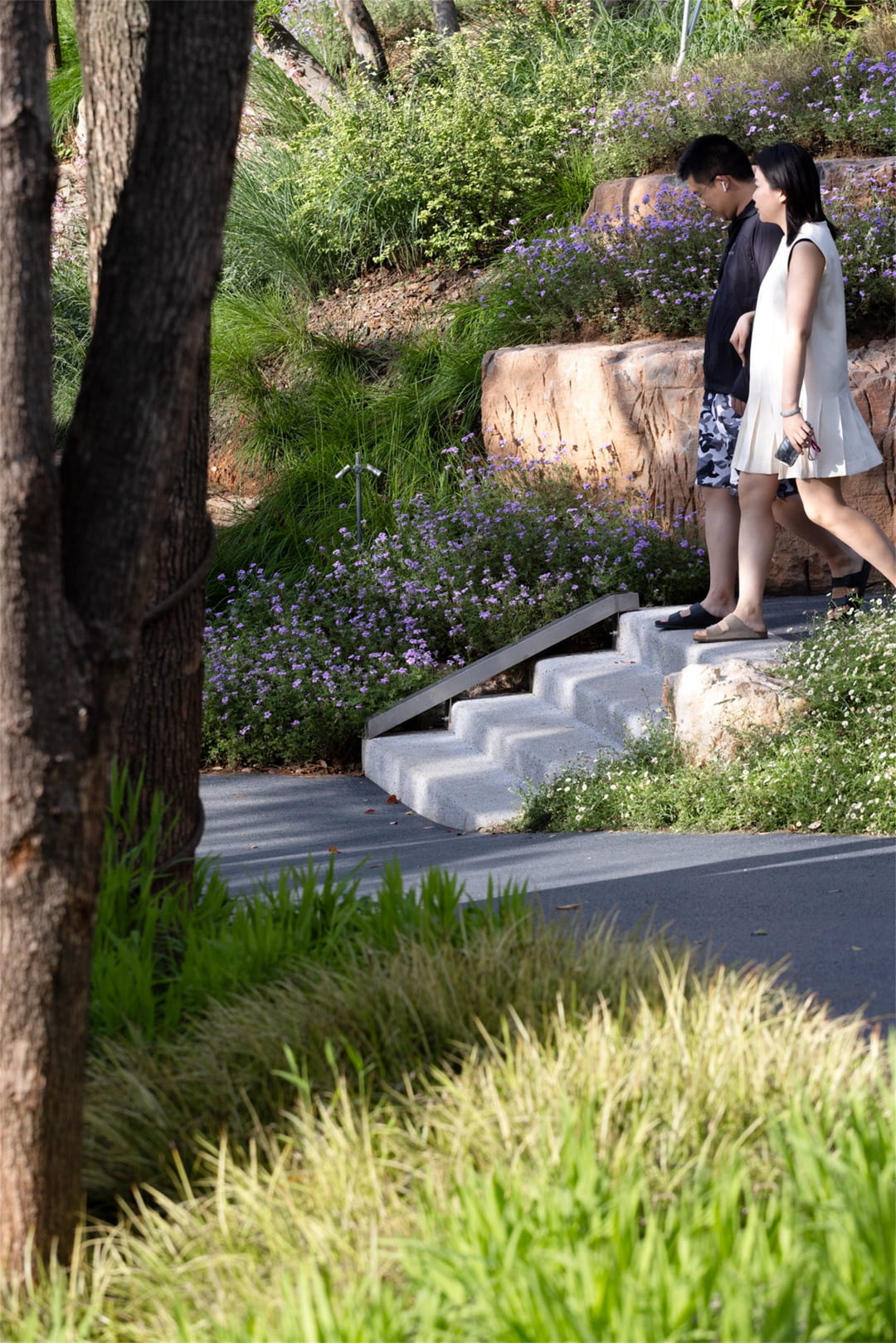 另外,地面材料、地被植物等,也是以最具性价比的方式做了规划。考虑适应性极高的透水混凝土、洗米石、预制混凝土汀步(部分利旧)、防腐木等,适应区域调性也为商家听提供更好的适配度。地被则是按区域划分不同表达主题,尽量因地制宜,节点处平地、边坡会有区域内风格表达,其他公区则是借由地形空间顺势而为,做到尽量自然又适度克制。