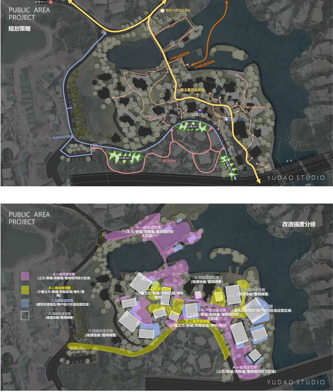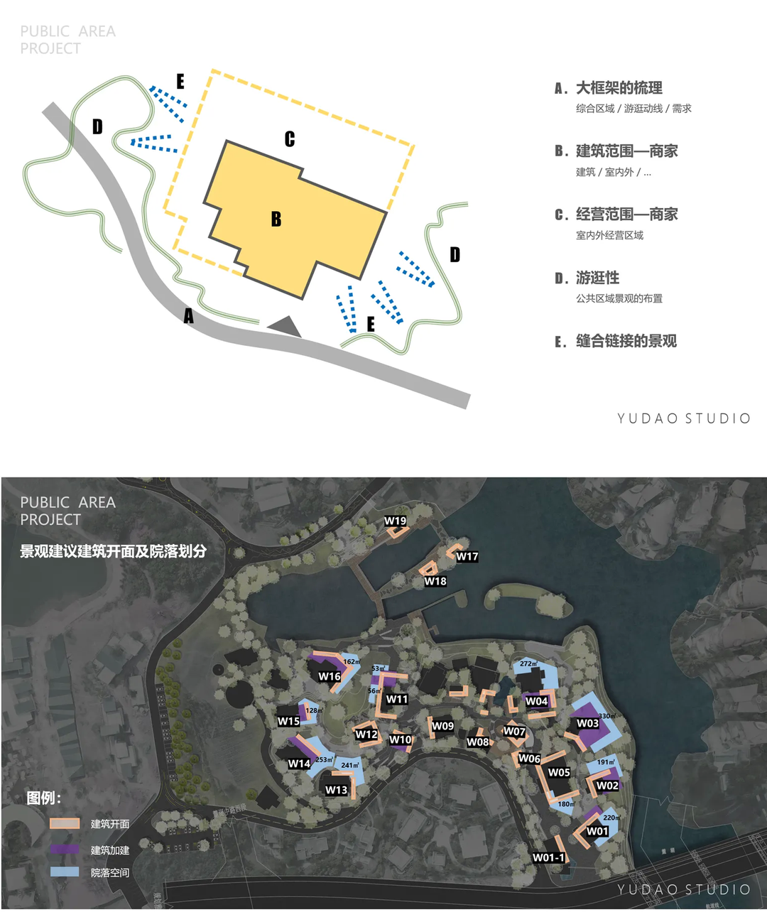 本项目一大特色也是难点,就是从单纯游逛空间转变为带有经营性质的商业空间,所有的物理空间会根据使用功能进行调整。并且由于前期对于项目综合测算,场地改造的工程费用非常 “节约”,在复杂地形中实现改造的目标也会变得更难。