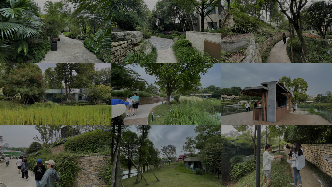 Additionally, we planned the ground materials and ground cover plants to be cost-effective. We considered highly adaptable materials such as permeable concrete, exposed aggregate concrete, reused precast concrete stepping stones, and treated wood, ensuring they fit the regional character and provided better adaptability for businesses. Ground cover themes were expressed differently in each area, adapted to local conditions. Flat areas and slopes at nodes featured regional style expressions, while other public areas followed the natural terrain, aiming for a restrained yet natural appearance.