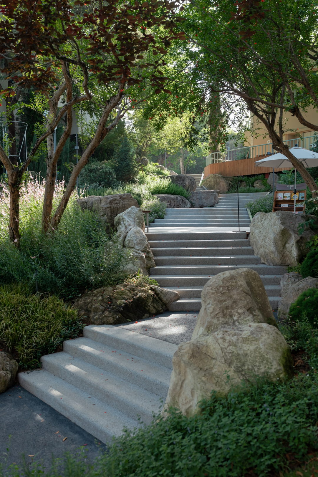 The site has significant elevation differences, with buildings scattered on terraces at various slight elevations. Numerous extreme spaces require steep slopes for adaptation. The original site used various naturally styled stone retaining walls, and creating new textural expressions would be costly. We chose to retain these, using thematic expressions in the ground cover layers to unify the stylistic features within the regional space. This approach maintains a fresh and clear hierarchy, emphasizing the natural stone walls to balance visual relationships.