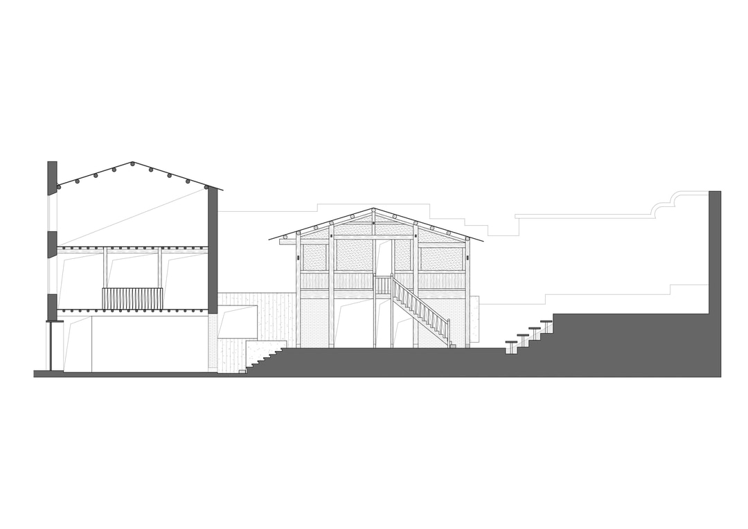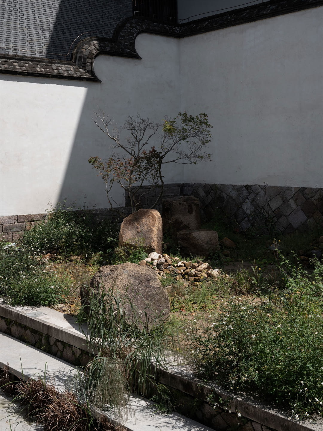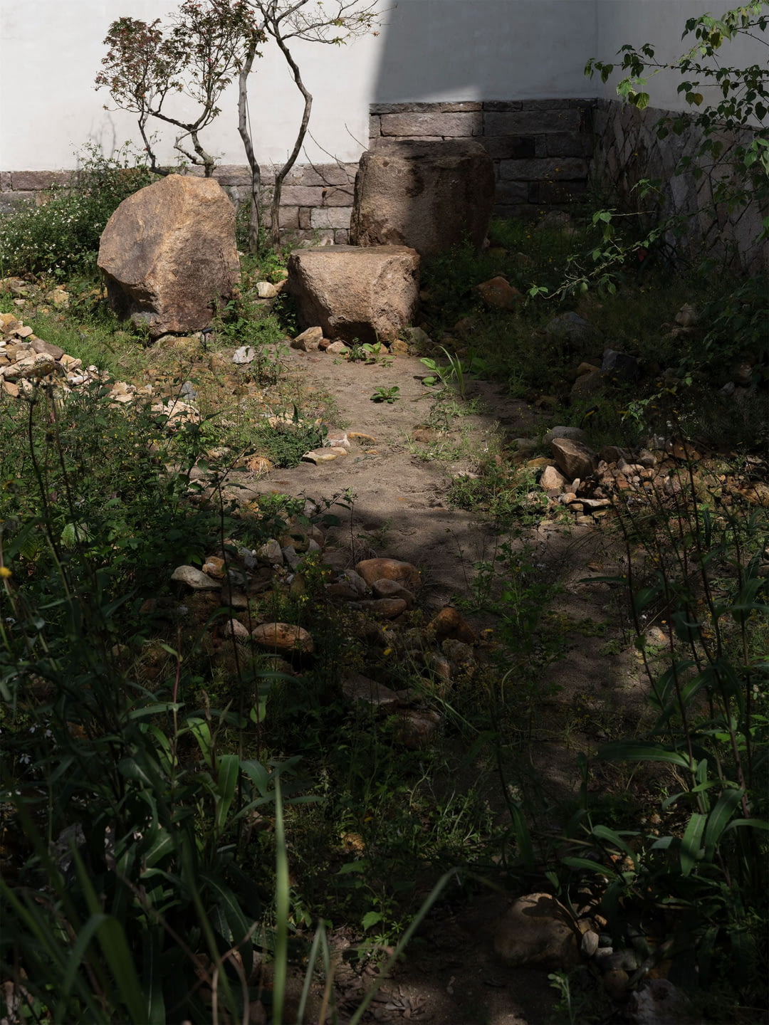 一二楼之间、一二进之间,被天井、拉窗、连通廊打通。原本狭小封闭的 “柴栏厝”(柴楼)被打开,宽的窗台成为座位区,柴楼和大埕之间过大的高差则被阶梯座椅消化,整个户外是贯通的,人可以随意就坐下。而原用于晾晒橄榄的大埕,如今是自然粗粝的景观。我们垒砌石块、撒下石砾和草种,下次再去时,繁茂的植物已经从石砾中冒出来,将一条小路藏在其中了,我们希望它不同于别致的园林和精致刻画的造景。