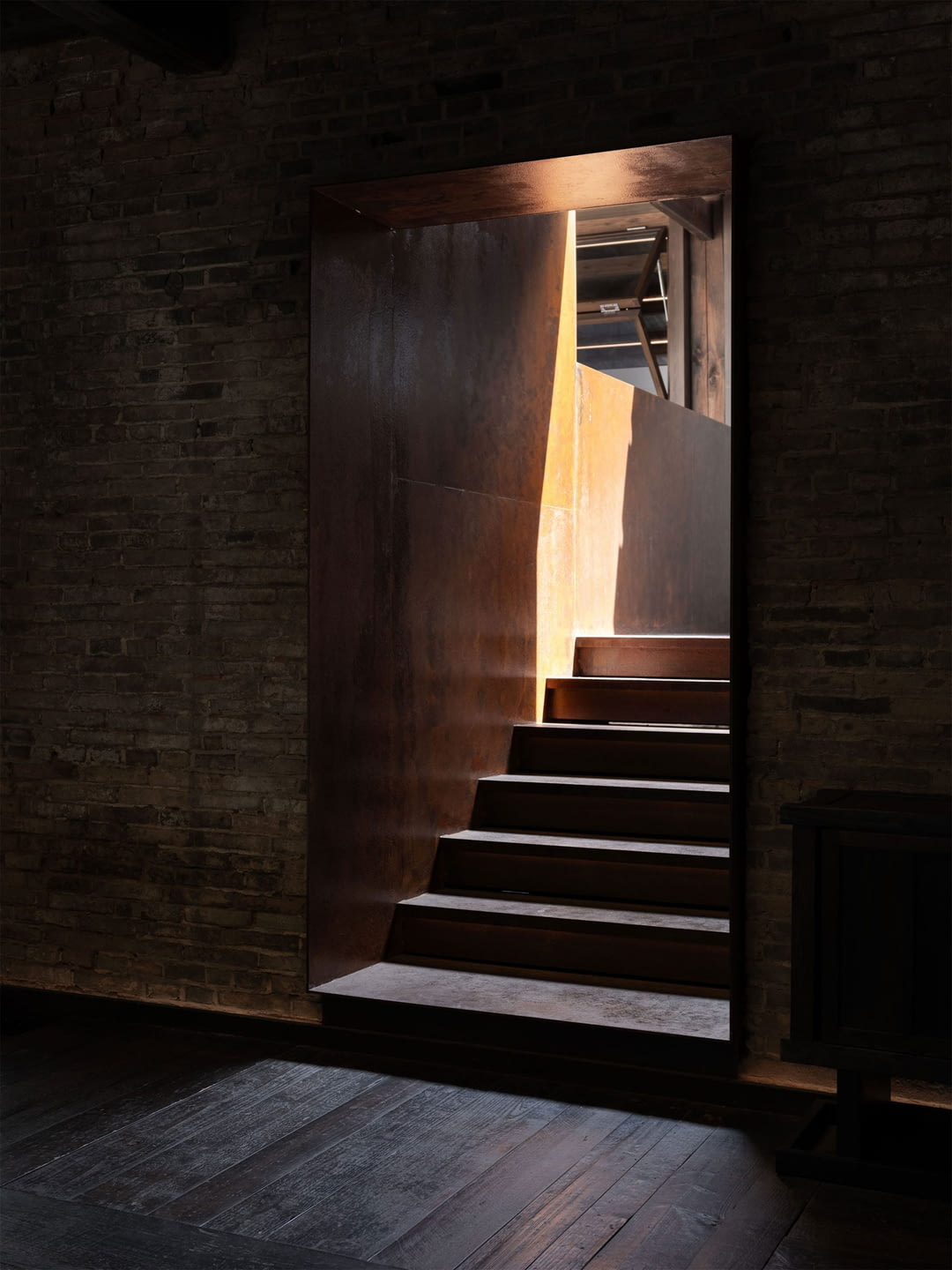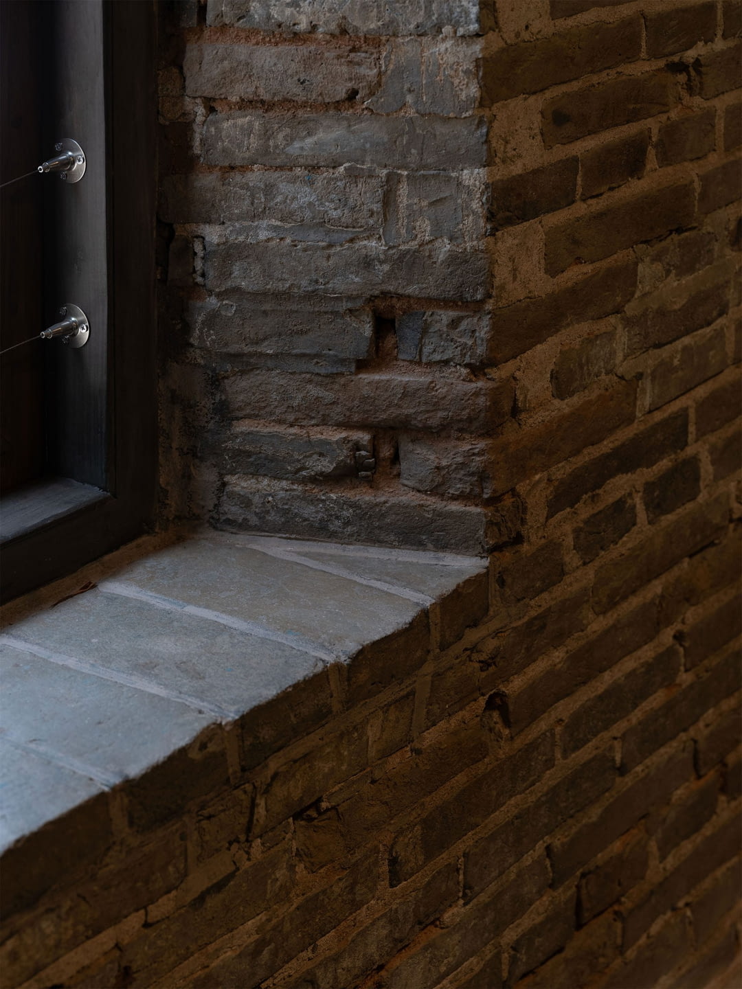 而当它的表皮被一点点剥开,露出建筑和时间共同的肌理,它也给了我们正向的反馈。我们将更多精力花在了找到以前的工艺修补,以及用现代技术去保护它原有的沉静和温度感,或者用一些新材料去辅助它将自己的气质散发出来,而不是过分矫正咯吱作响的木楼梯,或者没有任何一条直线的墙面。这些松动同样可以视为它的一部分,既是闲适的,也是不那么理所当然的。金属细线结构被引入到这些松动当中,也克制了松动。